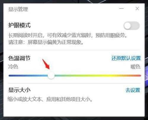4、看到色温调节一栏,拉动箭头指着的按钮即可自由调节屏幕色温,如下图所示。