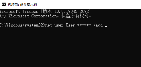 3、复制粘贴输入以下指令:net user User ****** /add (User是新建账户,******是新建的密码)net localgroup administrators User /add(赋予该账号管理员权限)。